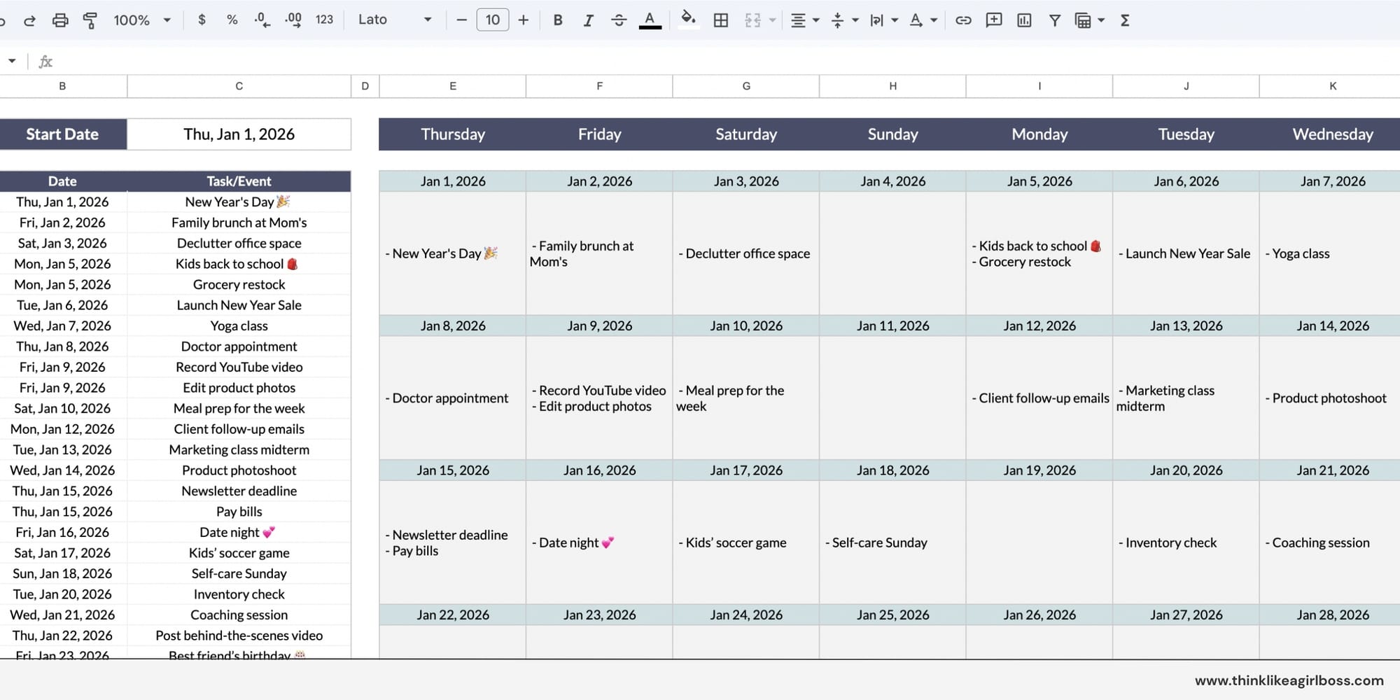 This is a Dynamic Calendar I built in Google Sheets. You add your task, set the date, and it automatically appears in the calendar view right next to it. Choose your start date and the calendar updates automatically.
