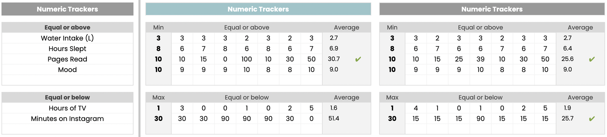 Below each weekly habit tracker you will find a space to save numeric values (number of hours slept, pages read, steps taken, screen time, mood, etc).