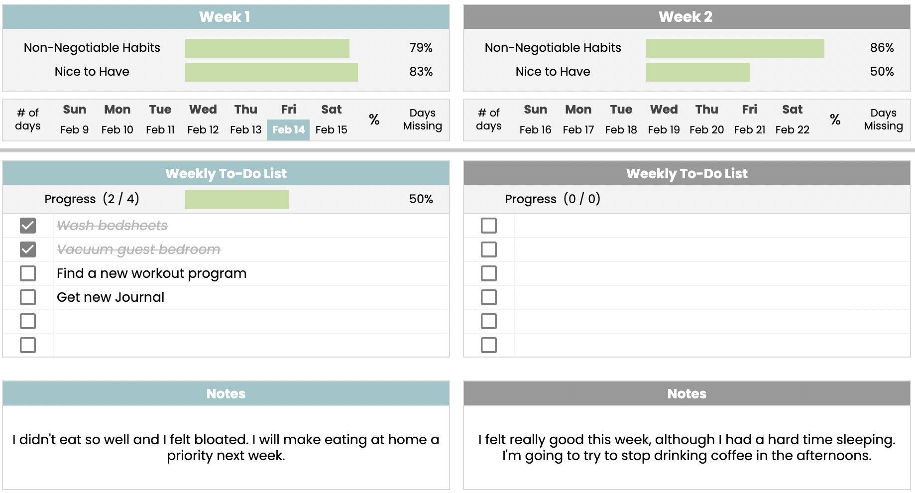 - The Notes section is a great place to reflect on what you did right each week and what you can improve next week.