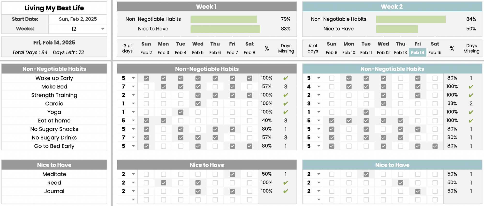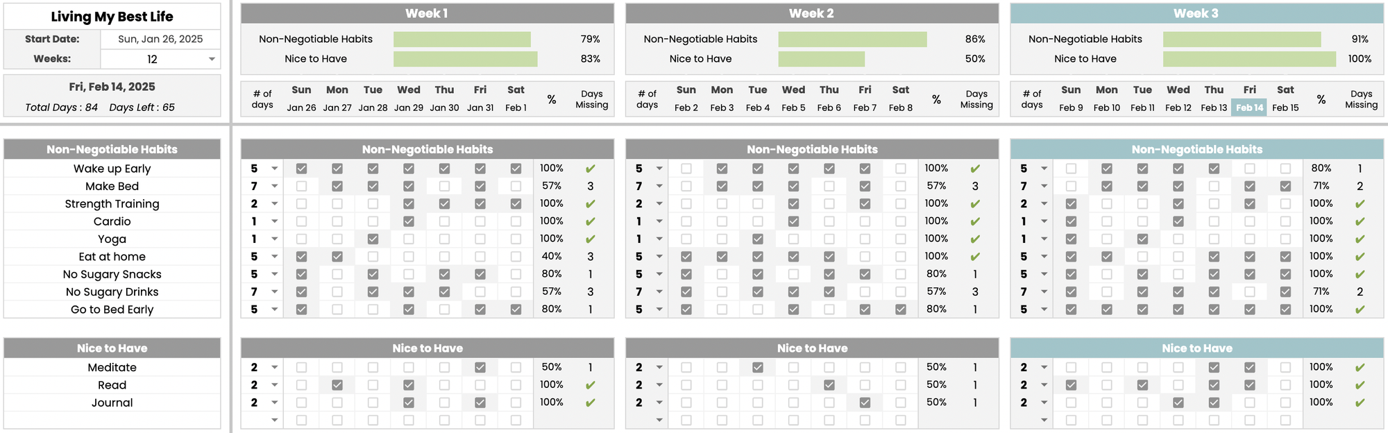 - Each habit will reach 100% once you check the number of boxes that matches your weekly goal.